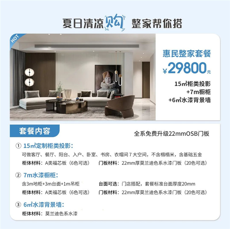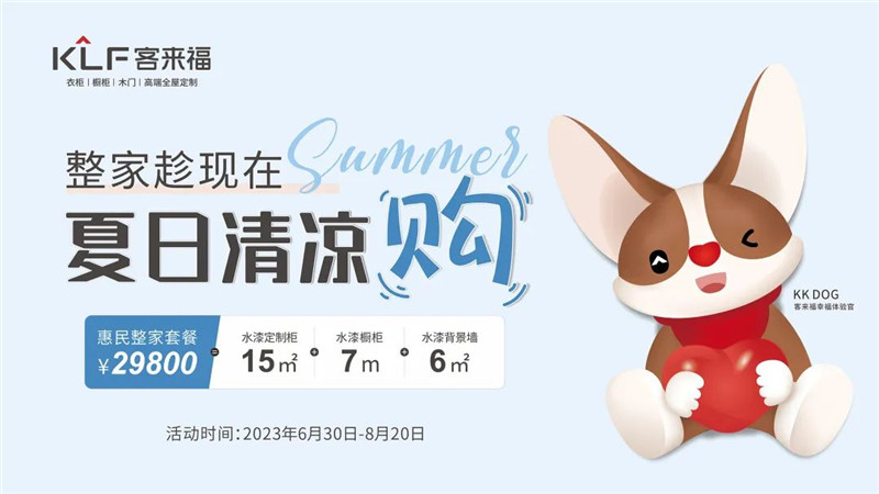 2023年6月30日-8月20日,客來福年中大促帶來惠民整家套餐¥29800,甄選水漆福芯板并嚴格遵守國家環(huán)保等級標準,打造高性價比的健康環(huán)保整家。