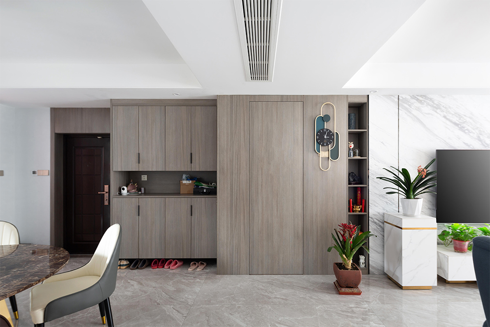 從玄關(guān)處進(jìn)門,可以看到在平行于玄關(guān)的一邊處做了整面式的柜子,采用整柜到頂?shù)姆绞?,灰橡木色的柜門與大理石紋路的地磚,在顏色上遙相呼應(yīng),形成了一種高雅靜謐的感覺。