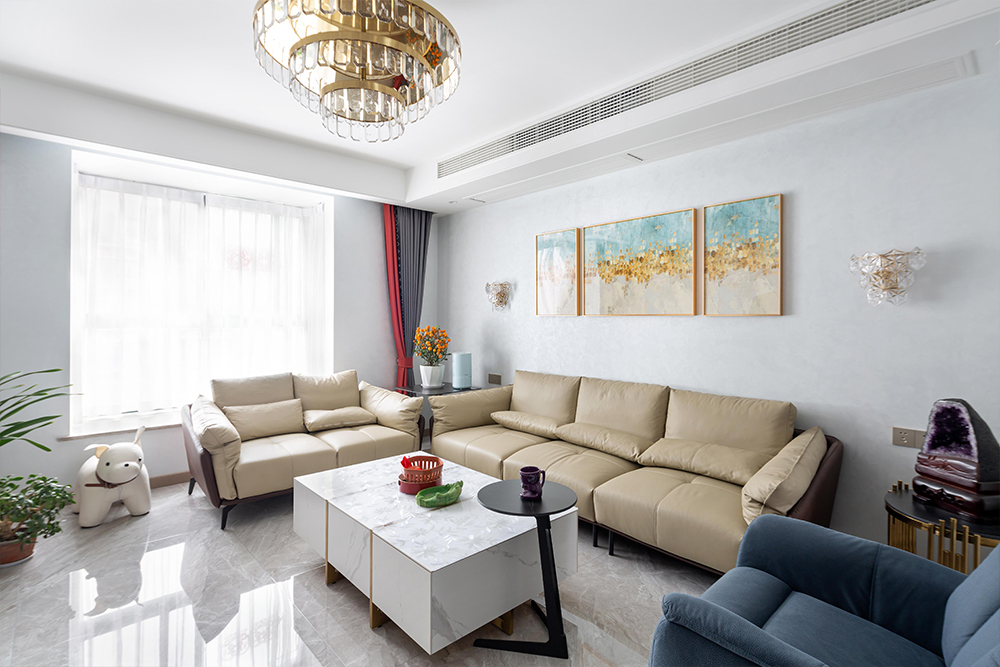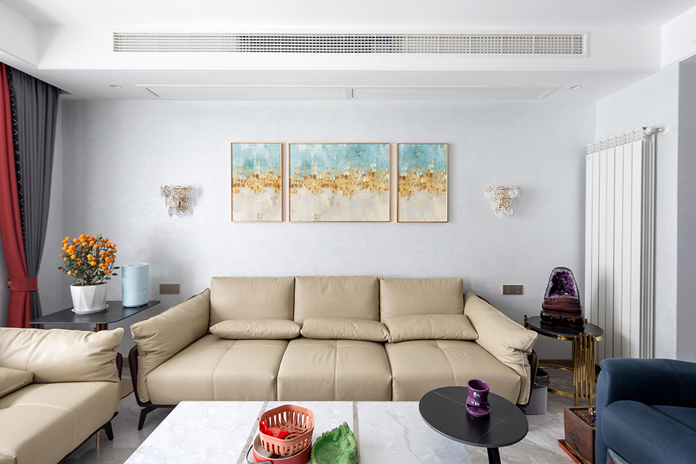 從客廳處映入眼簾的便是郁郁蔥蔥的綠植,體現(xiàn)出屋主對(duì)于生活認(rèn)真的態(tài)度??蛷d的墻面板采用白色大理石紋路,墻面的裝飾畫給整個(gè)空間增添了美感。