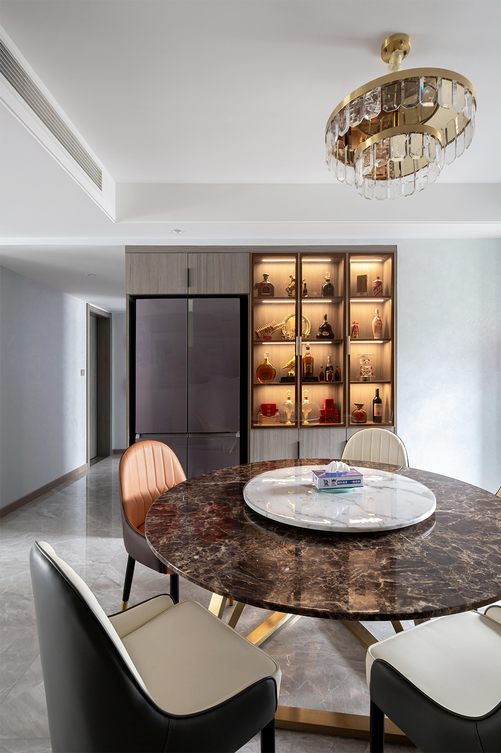 廊道右側(cè)便是餐廳所在區(qū)域,地板與餐桌表面都采用大理石紋路的磚面,顯得典雅又輕奢。后方做了一整面的酒柜與墻面相連。左側(cè)在酒柜旁做了冰箱柜,嵌入式冰箱放置節(jié)省了占地空間,整面式的做法有一種舒適的視覺感。