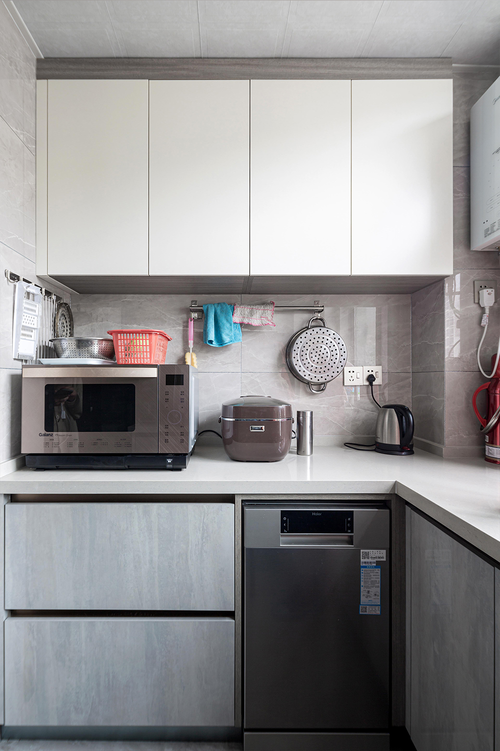 廚房在風(fēng)格上延續(xù)了現(xiàn)代簡約的風(fēng)格,采用U 形的廚房布局設(shè)計(jì),在臺(tái)面下方做了一個(gè)與陽臺(tái)洗衣機(jī)柜相同的柜體。左側(cè)做了廚具收納,右側(cè)放置家電,在布局上不僅美觀,而且同時(shí)具備了收納的功能。