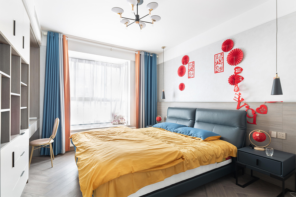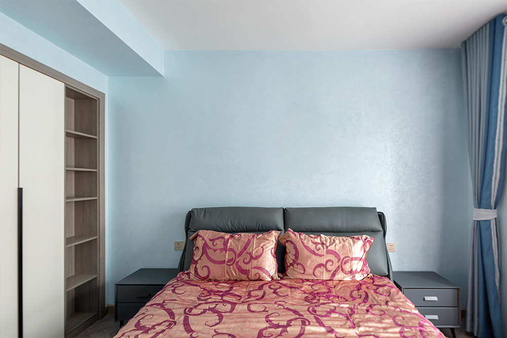 用藍(lán)色墻布覆蓋在墻面,對(duì)墻面起到很好的保護(hù)作用。次臥最大的亮點(diǎn)在于房間內(nèi)設(shè)計(jì)了一個(gè)隱藏的衣帽間,在柜子內(nèi)做出了U形的布局,將內(nèi)部空間分層,可以放置衣物和棉被。空間內(nèi)部既不會(huì)顯得突兀,關(guān)上柜門之后內(nèi)部空間更加完整。