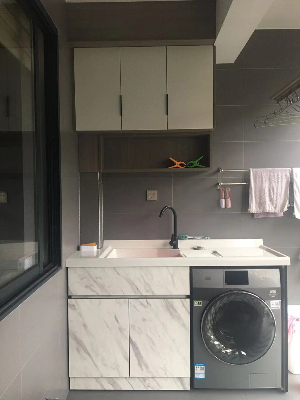 連體的洗衣機(jī)柜臺(tái),下方采用白色大理石紋路的柜門。上面做了掛柜的設(shè)計(jì),既節(jié)省空間,又方便了物品的放置。