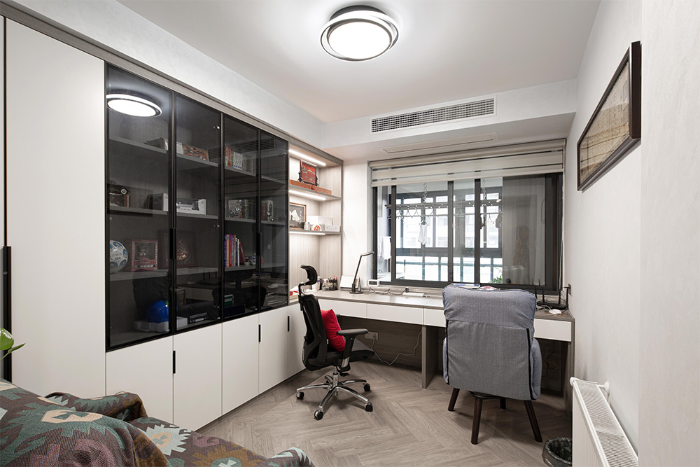 書房內(nèi)部的空間十分的大氣,白色加黑色玻璃柜門的設(shè)計(jì),分層儲(chǔ)物方便又快捷。長條的書桌可以同時(shí)容納兩個(gè)人辦公,勞累的時(shí)候通過窗戶便可以眺望遠(yuǎn)方,緩解疲勞。