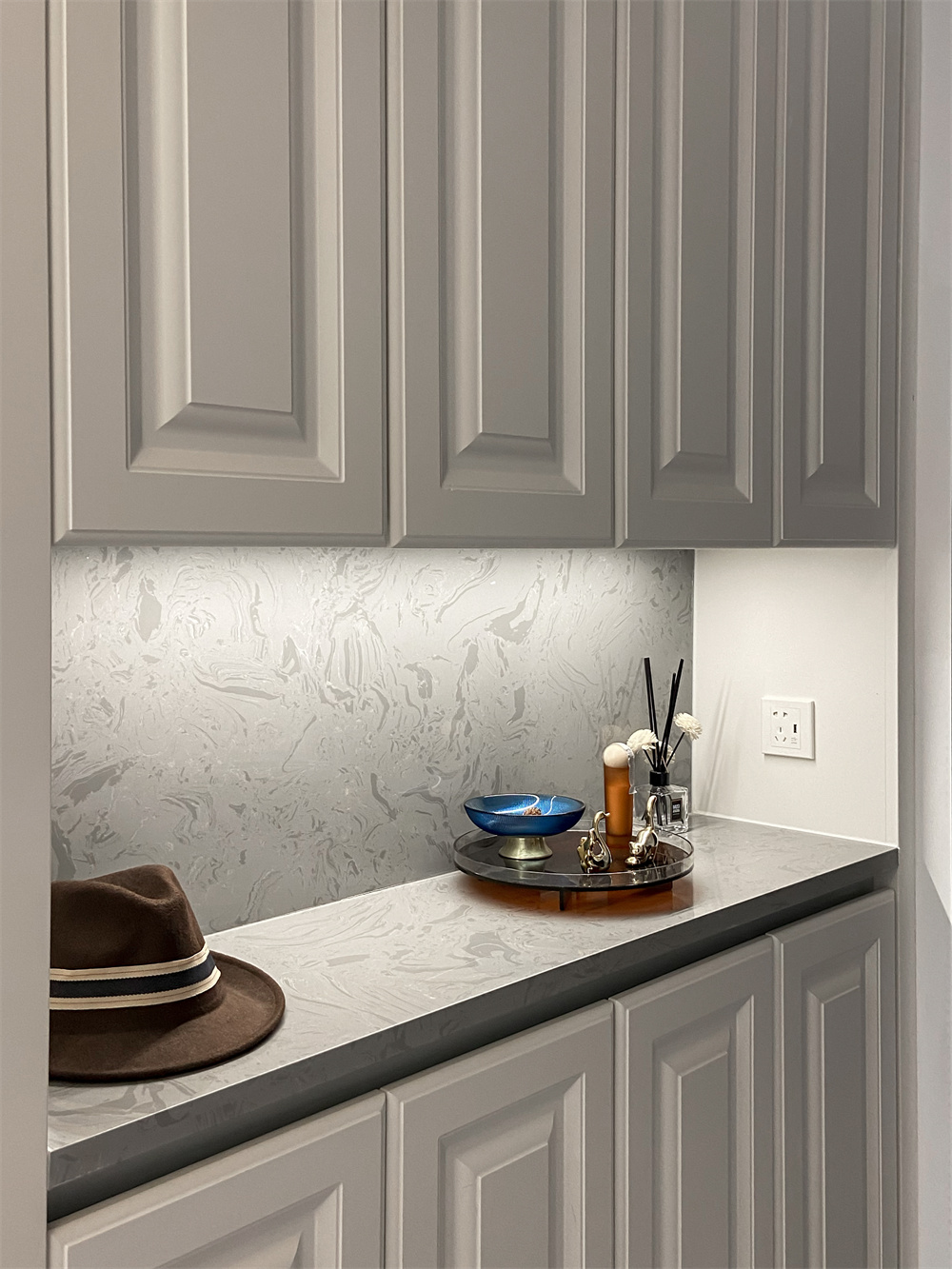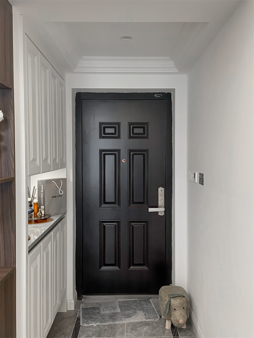 定制的整面到頂?shù)男P(guān)柜,芬蘭白的顏色頗為典雅,中部的空余部分可以放置鑰匙包等生活物品,在到頂鞋柜的底部同樣留出一排空間,放一些常換的拖鞋,掃地機(jī)器人也能進(jìn)去清掃,衛(wèi)生無死角。玄關(guān)的柜子都做了無拉手設(shè)計(jì),相對(duì)比較整潔。擺放一些精致的小飾物,體現(xiàn)出屋主優(yōu)雅的品味。