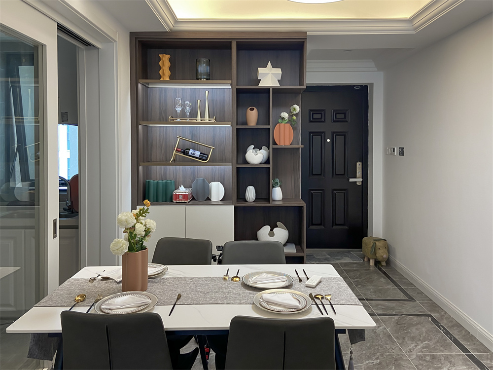 整排的餐邊柜收納柜,讓功能性大大加強(qiáng),平常的餐具、藏酒都可以妥妥的安排下,開放的柜子作為展示,也可以放置一些??吹臅脱b飾擺件。餐桌上擺放花束讓吃飯多了一絲溫馨,餐邊柜的不規(guī)則設(shè)計(jì)柜層,不僅滿足不同高度物品收納的需要,使整體更加具有層次感。