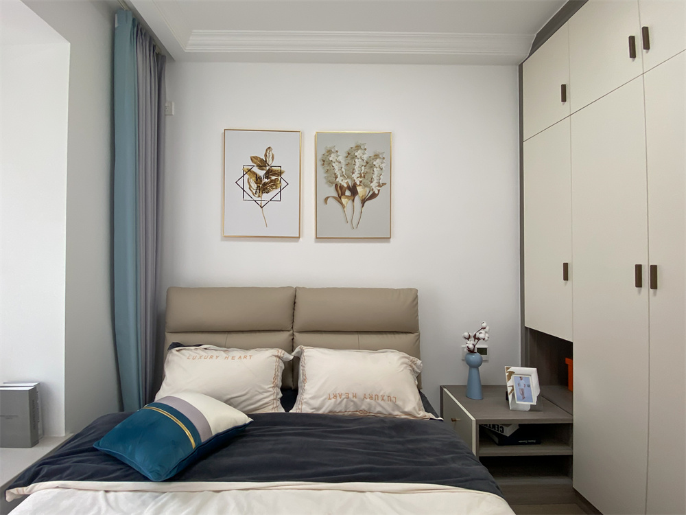 白色床單和灰色床頭的顏色搭配,整體更加輕松簡(jiǎn)潔。芬蘭白整面衣柜為衣物收納提供好住處,側(cè)面板可以打開內(nèi)置長(zhǎng)方形小鏡子,梳妝完成后可以通過鏡子看一看今天的氣色,感受不一般的心情。