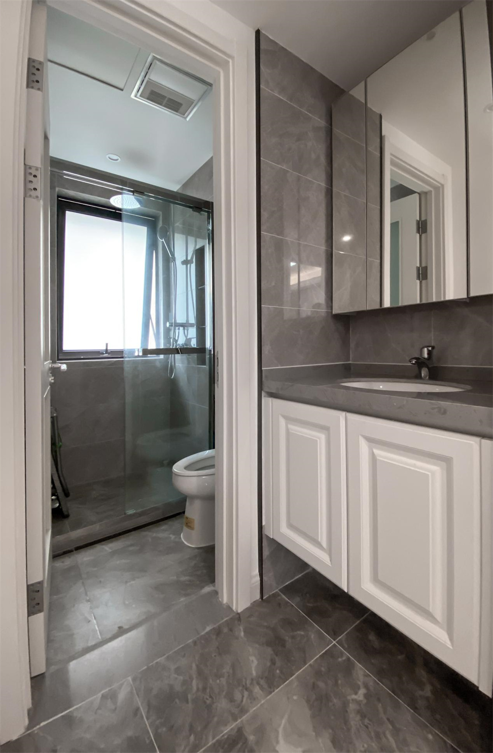 衛(wèi)生間做了干濕分離,大面積的鏡柜提供更多收納的同時(shí),也擴(kuò)展了空間視覺感,柜下的燈帶還能給面部照明提供額外的光線輔助。