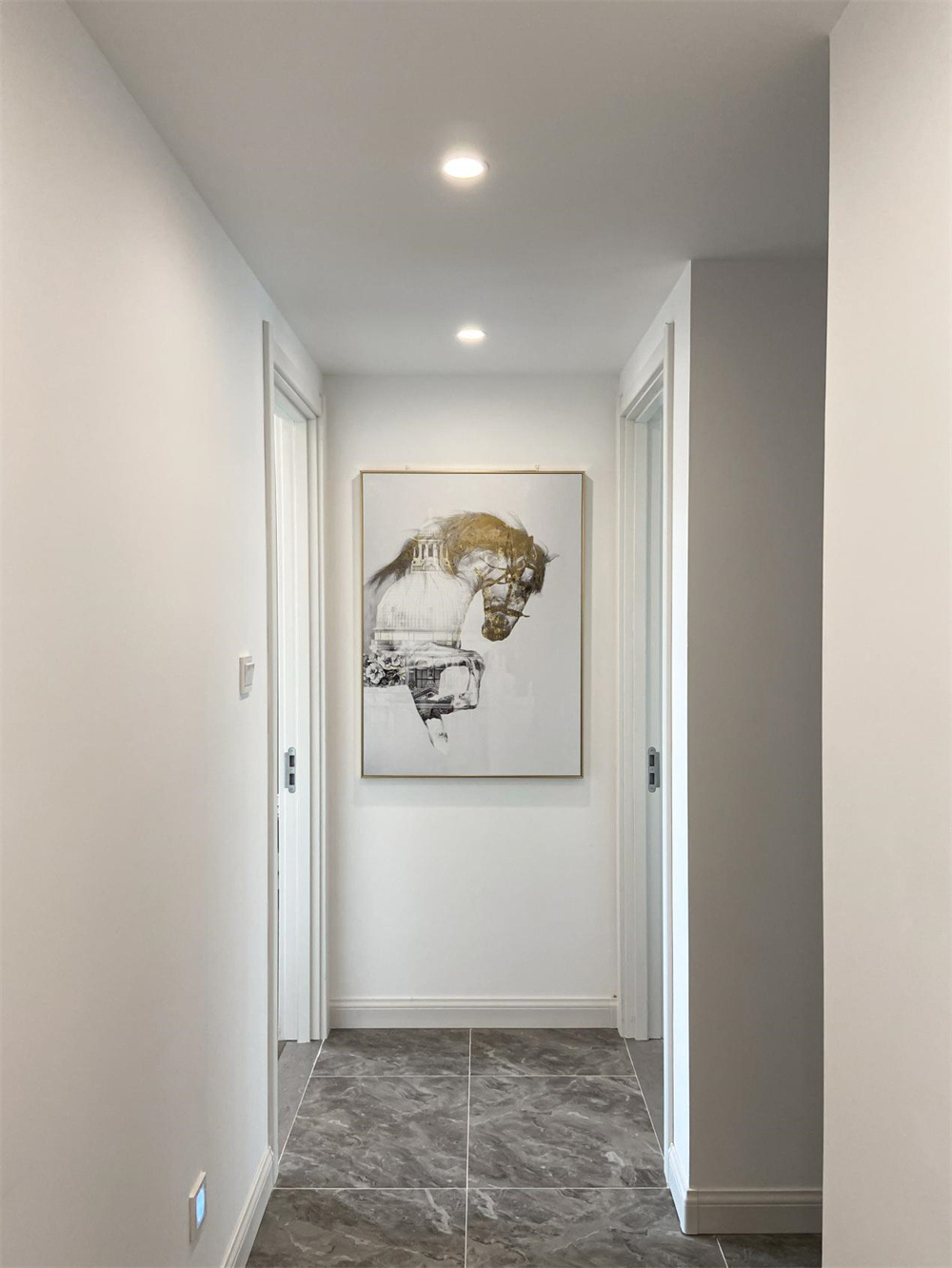 對(duì)于走廊空間較小的房屋,建議在走廊兩側(cè)放置一些精美的掛畫,可以根據(jù)自己的喜好選擇,白色的墻面略顯的有些空蕩,這樣可以增加空間內(nèi)的豐富感。