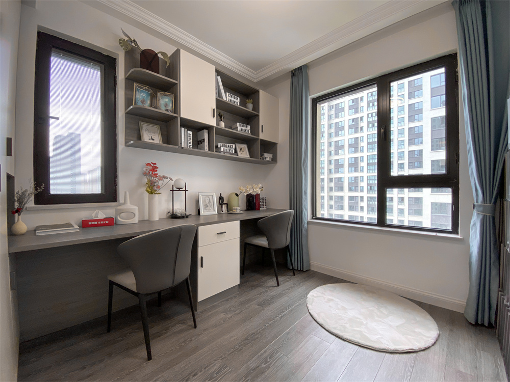 先是整面的柜子,然后與柜體相連接的書桌。吊柜采用灰橡木紋加芬蘭白的顏色搭配,從板材中透露出時(shí)光的內(nèi)涵。書桌的長(zhǎng)度兩個(gè)人一起辦公、聽音樂、品茶都是不錯(cuò)的選擇,在工作之余放松自己也不失為一種享受。