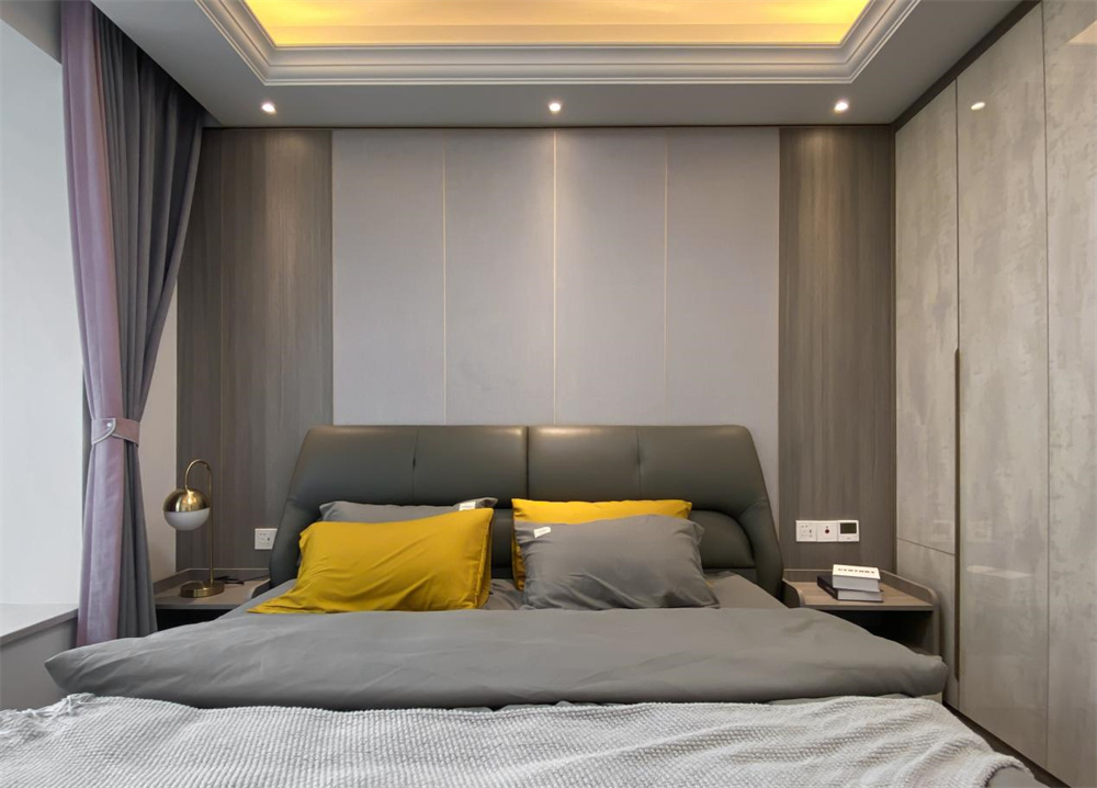 主臥整體延續(xù)輕奢的風(fēng)格,以黑白灰襯底。背景板用的是灰白兩色護(hù)墻板,呈現(xiàn)簡(jiǎn)約干練的特質(zhì)。墻面未著任何的點(diǎn)綴,卻也不顯得空曠突兀。以灰色為主調(diào)的舒適床品,加以穿插其間的黃色調(diào),在床頭射燈的氛圍烘托下,時(shí)尚又不失溫馨感。