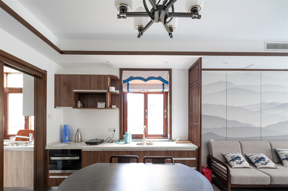 餐廳處沒(méi)有多余的修飾,前方定制了整體的餐邊柜,安裝了洗手池、轉(zhuǎn)角柜等設(shè)計(jì),方便在吃飯后清洗手。窗戶上面采用拉伸式窗簾的設(shè)計(jì),在吃飯時(shí)便可看見(jiàn)窗外的景色。轉(zhuǎn)角柜的設(shè)計(jì)便于放置一些熱水壺、碗筷、抽紙等日常物品,在吃完飯便可拿取抽紙來(lái)擦拭。