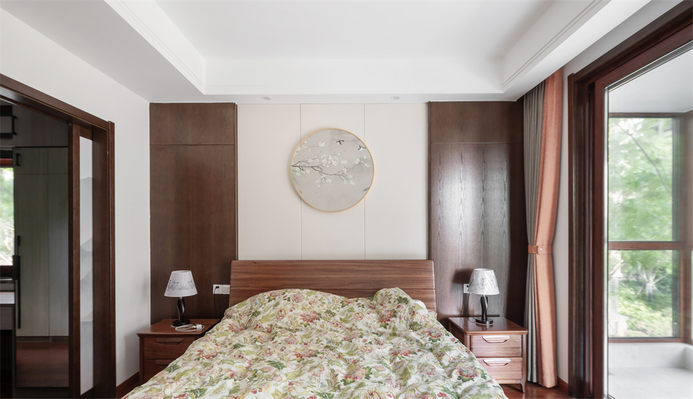 主臥處背景與床單的花紋配色透露出一股春天的和煦美好。背景墻上的重視掛畫(huà),蜿蜒生長(zhǎng)的枝條,成群飛翔的燕子展現(xiàn)出自然的生機(jī)。右側(cè)帶了一個(gè)陽(yáng)臺(tái),外面枝葉茂盛,樹(shù)葉搖動(dòng),臥室被綠意包圍。