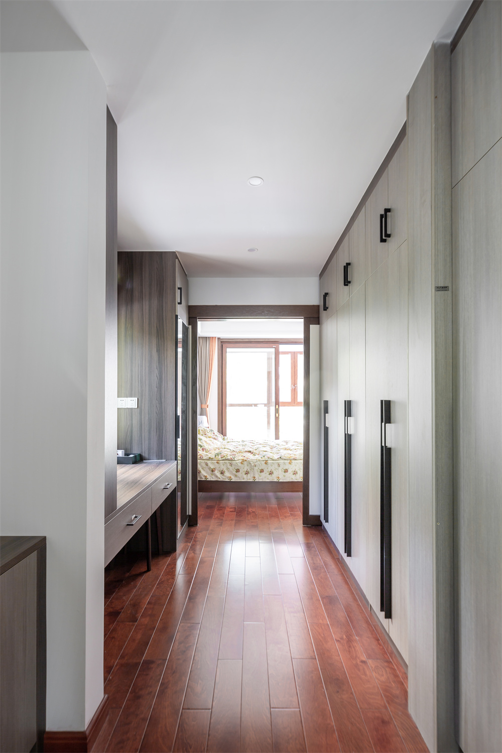 走廊雖然與主臥相連接,但是臥室處中間采用推拉門的設(shè)計(jì),關(guān)上就是兩個(gè)各自獨(dú)立的空間。走廊處整面到頂?shù)囊鹿瘢梢援?dāng)做整體的衣帽間來(lái)使用,收納衣物的能力很強(qiáng)。