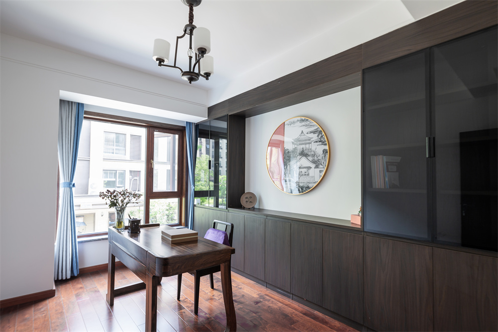 書(shū)房是屋主特地為愛(ài)人準(zhǔn)備,便于愛(ài)人日常辦公的需求,特地選取了一間風(fēng)景優(yōu)美的房間作為工作區(qū)域。仿佛如黃鶴樓般的裝飾畫(huà),處處透露出濃郁的中式風(fēng)。茶色的玻璃柜可以映照出窗外的景色,在這里辦公非常安靜,可以集中精力思考處理事務(wù)。