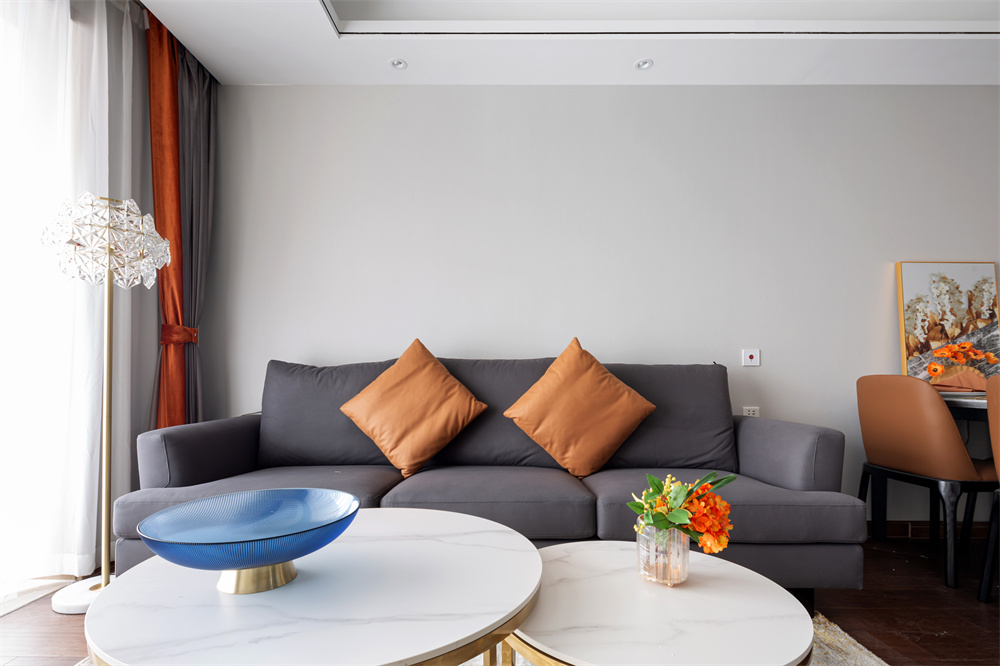 布藝灰色沙發(fā)布料十分柔軟,坐下去沙發(fā)表面也具有一定彈性。橘色的抱枕仿佛將整個空間點亮了一般,與右側的橘色座椅顏色相呼應。圓形拼接的茶幾在寓意上傳遞出“和諧”,搭配金色的桌腳一下子提升了高級感。