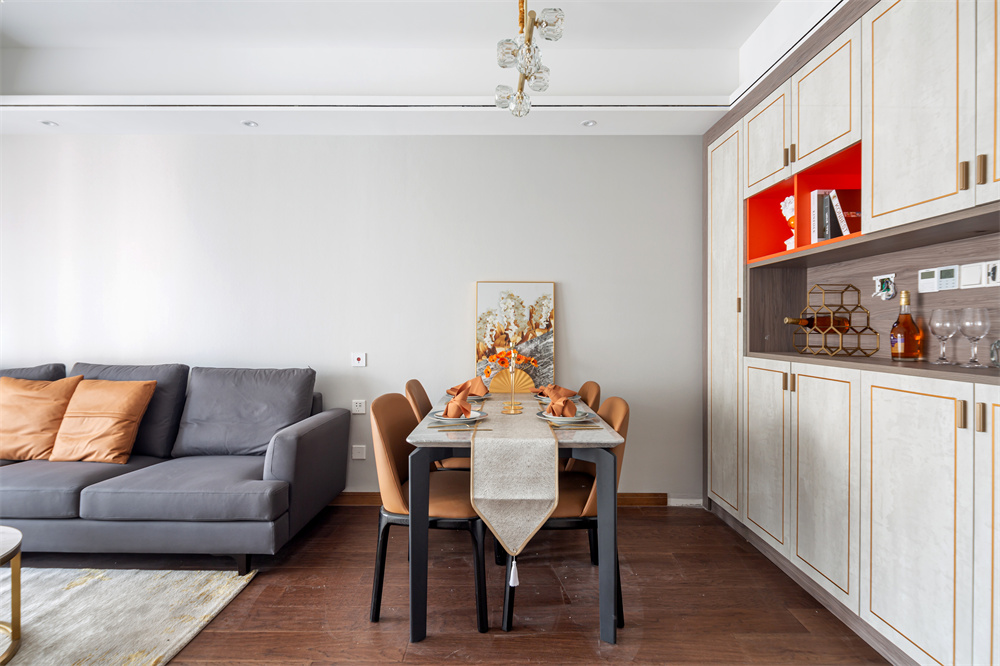 餐廳處的風格秉承了輕奢風格的特點,設計師采用橘色、金色、芬藍構成了餐廳的主色調(diào)。正面到頂?shù)牟瓦吂衽c墻面無縫銜接,通過餐邊柜上的擺件便可看出屋主的品味。裝飾物的點綴讓餐邊柜獨具魅力,金屬酒瓶的架子,對于日常喜歡小酌一口的家庭來說十分合適,如果再安裝酒柜的話空間不夠,餐邊柜的功能相比酒柜更加實用。
