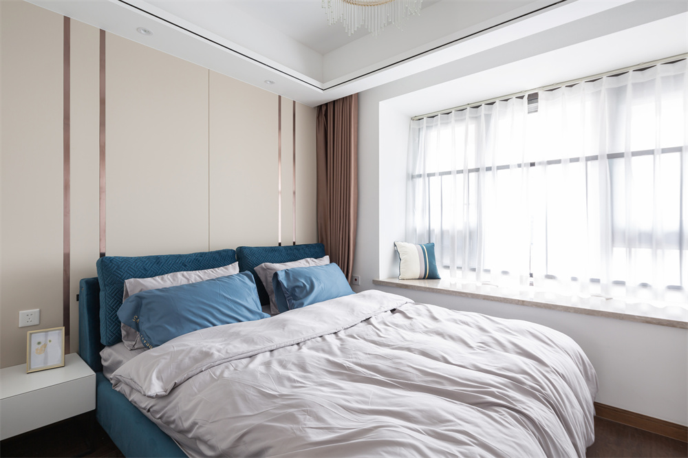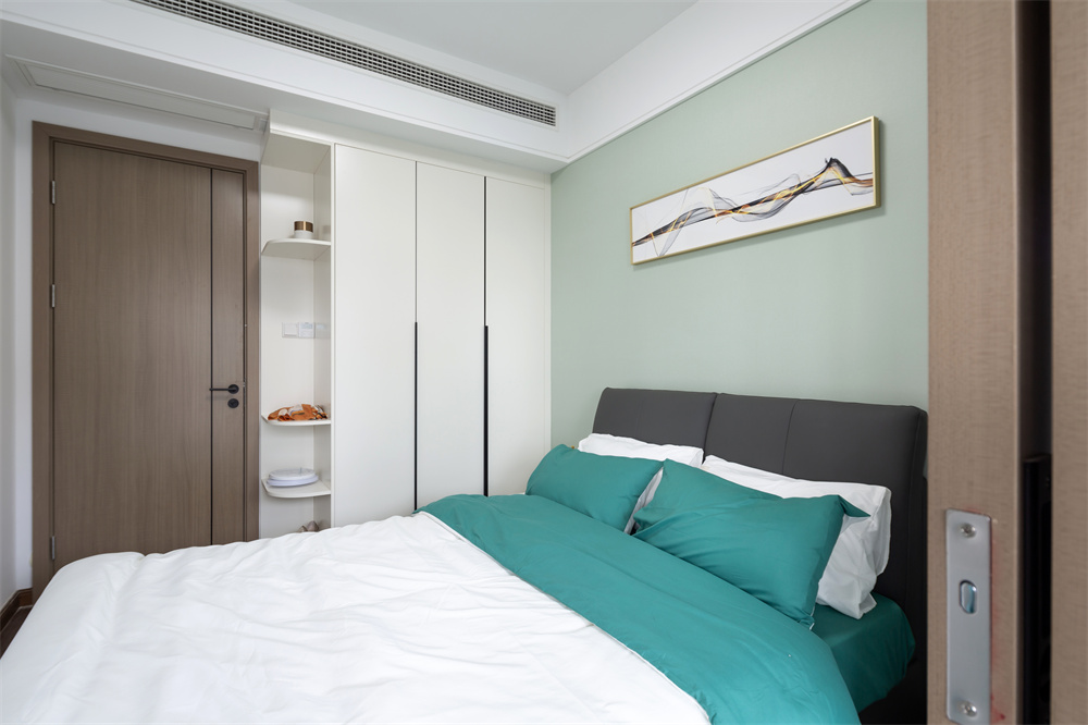 主臥室在沿用輕奢的風格同時做了細微的調(diào)整,薄荷綠色的背景顯得清新又自然,仿佛如修剪草地后散發(fā)的清香。衣柜延伸出的轉角區(qū)域充分利用了衣柜旁的空間,可以隨手放置書本、眼鏡、收納籃。