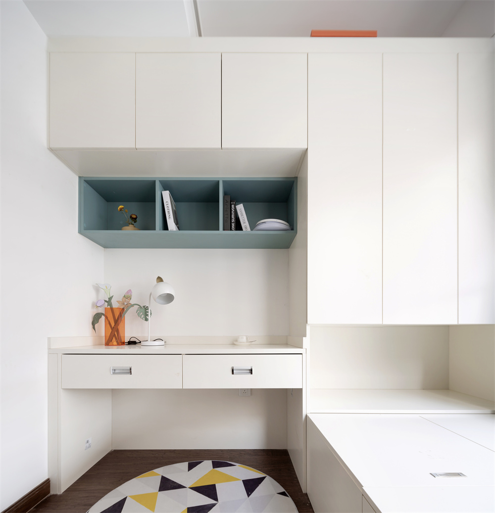 采用了書桌和榻榻米相結合的形式。抽屜中間留出把手的位置,具有自動吸附功能。幾何圖案的地毯增添了房間內(nèi)的俏皮感。