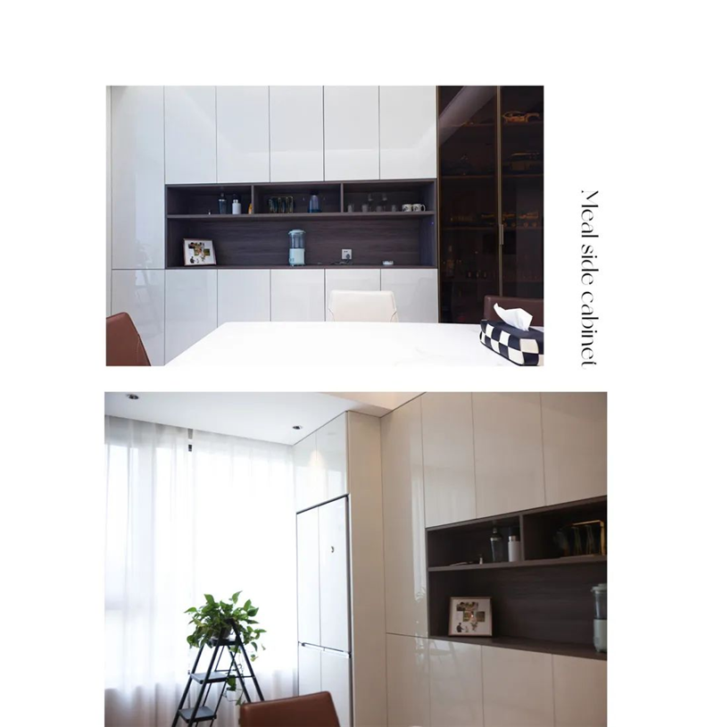 靠近餐桌柜子中部留空作常用品收納,甄選伊麗莎白&淺榆木,啞光與亮面碰撞更顯時尚;加兩豎排玻璃柜,外包金屬邊框,增強精致可觀性。