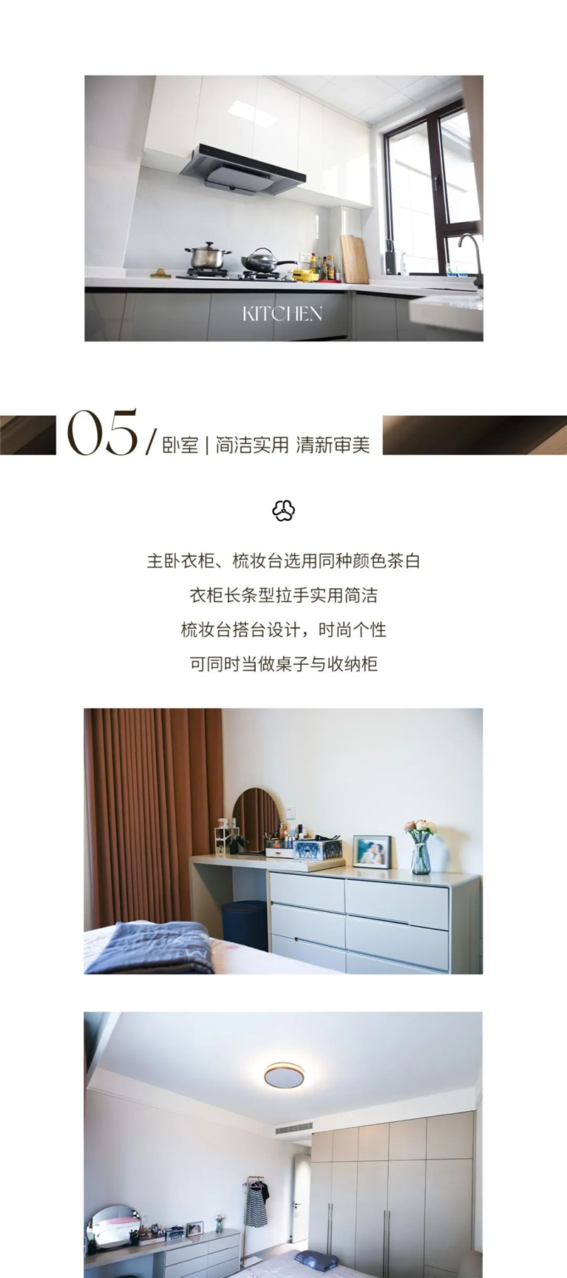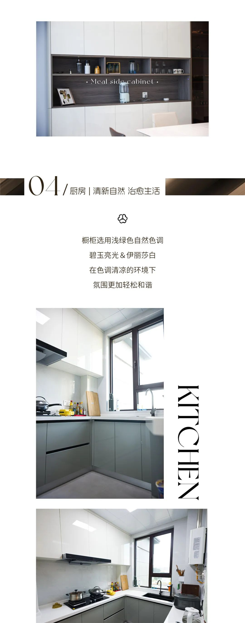 主臥與北次臥書柜都選用了茶白色作和諧統(tǒng)一,南次臥選用拼色設(shè)計,芬蘭白&蔚藍(lán),簡潔清新的特性與廚房的清涼色調(diào)相呼應(yīng)。