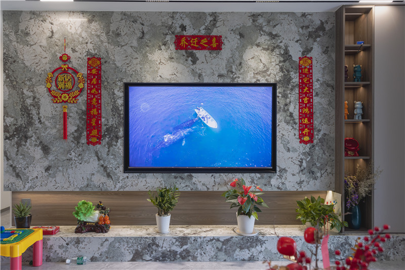 客廳整個(gè)打通后進(jìn)行地磚通鋪,延伸了空間視覺感,在客廳的空間設(shè)計(jì)上以簡(jiǎn)繁結(jié)合的方式,在電視柜背景墻上,以大理石石材進(jìn)行裝飾,為全屋帶去更多的冷感。