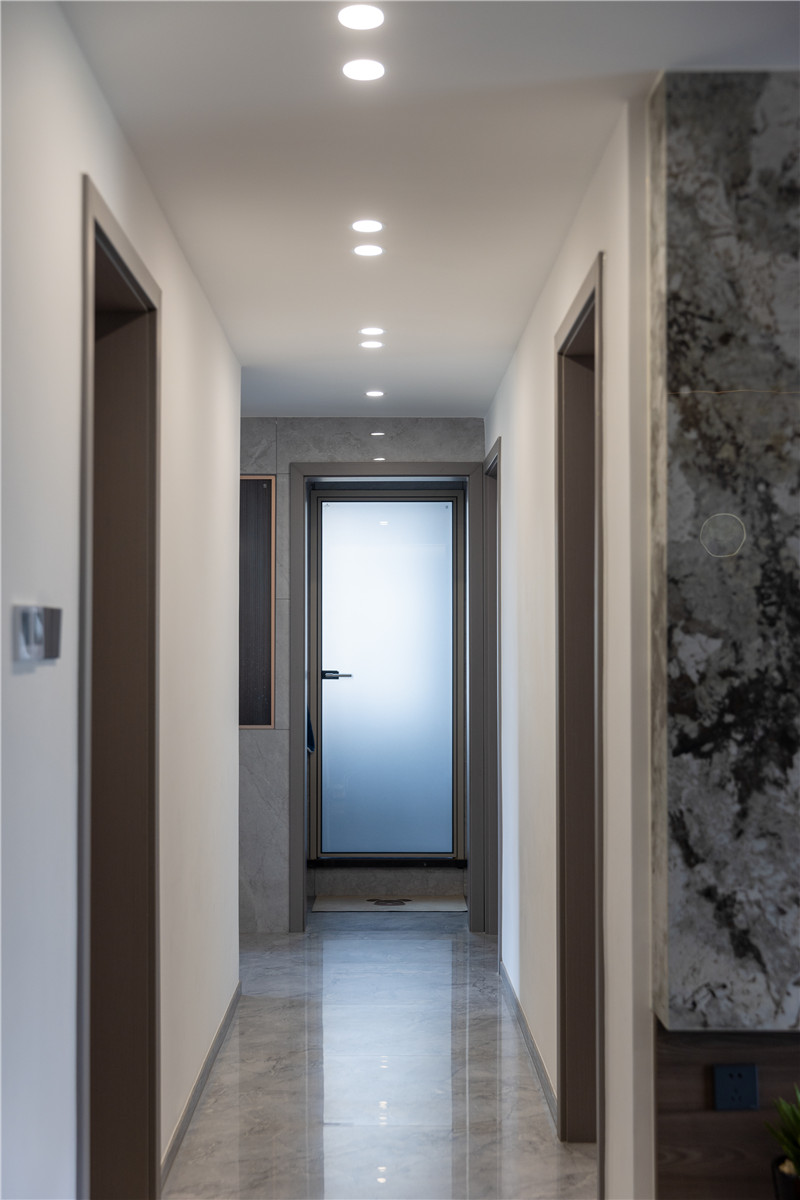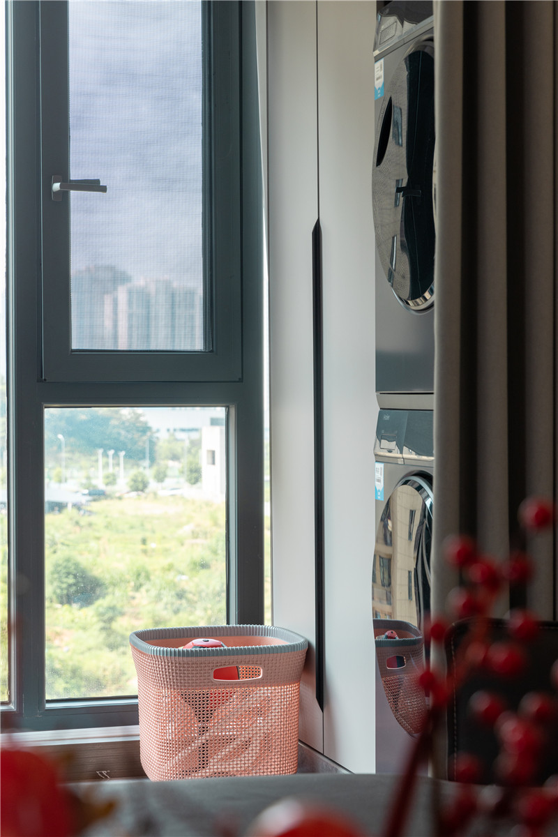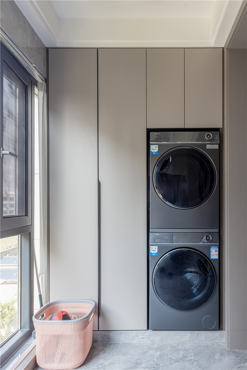 在這戶案例中,收納需求和居住的舒適性是屋主所追求的。所以在陽(yáng)臺(tái)空間上,屋主與設(shè)計(jì)師也通過兩組柜子讓家變得更干凈。一側(cè)做家政柜嵌入洗烘家電,到頂高柜內(nèi)部分區(qū)合理,很實(shí)用。