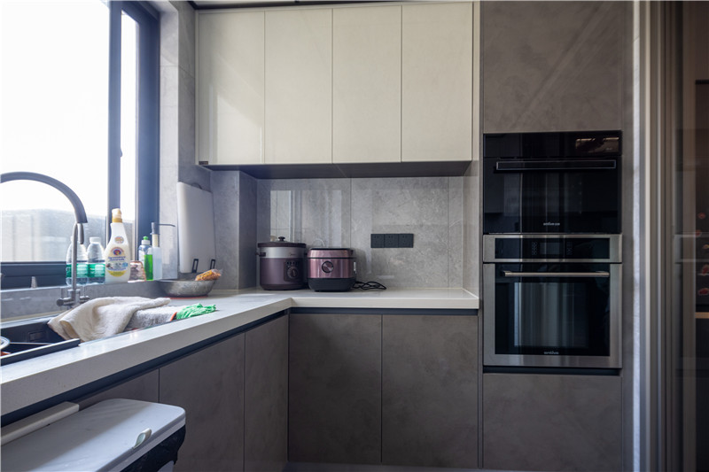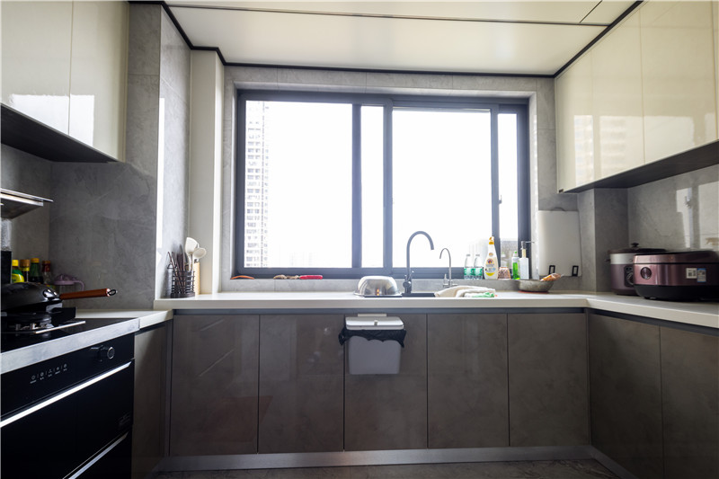 U型結(jié)構(gòu)的廚房設(shè)計(jì)更注重物品的收納,這種常規(guī)的吊柜+地柜的多重儲(chǔ)物空間,正是能促成有序整潔的環(huán)境。吊柜采用伊麗莎白,亮面材質(zhì)也很容易清潔。