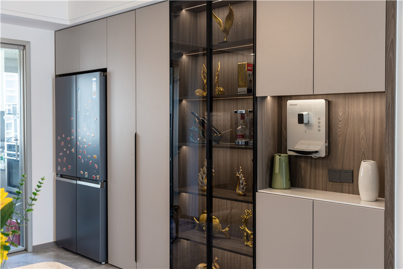餐邊柜留出冰箱位置做一體化設(shè)計(jì),中部做半透茶玻用于展示藏酒與擺件,側(cè)邊柜中部掏空做置物臺(tái)可以放置小家電和生活物品。整體餐邊柜的設(shè)計(jì)功能性很高,在實(shí)用的同時(shí)注重各分區(qū)的比例,給人更精致的感覺。