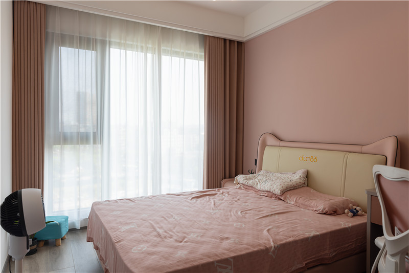 在女兒房的設(shè)計(jì)上,屋主以粉色調(diào)和藍(lán)色調(diào)塑造了兩間次臥。在次臥中,除了日常生活的睡眠區(qū),在衣柜設(shè)計(jì)中加入了書桌的元素,讓衣柜與書桌一體化設(shè)計(jì),開放格可做書柜使用,整體和諧又節(jié)省空間。