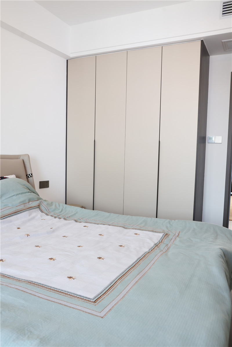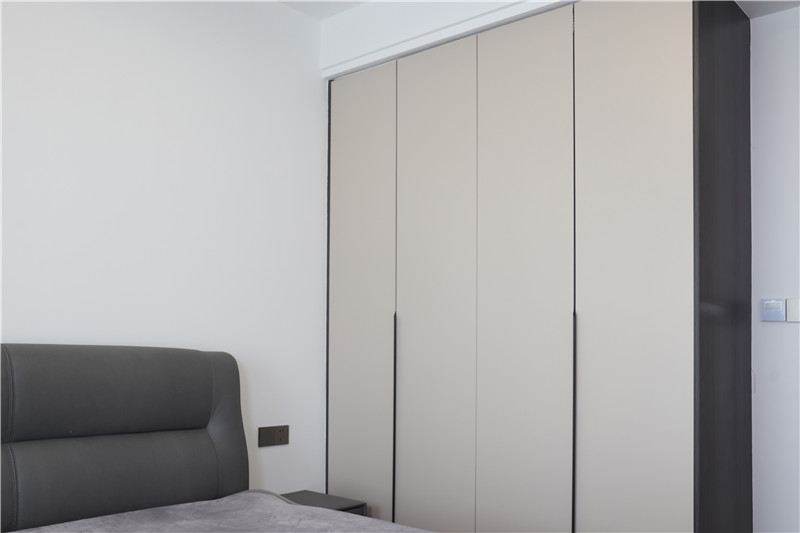 主臥與次臥根據(jù)不同人需求與生活習(xí)慣,都選用了客來??萍寄炯y+茶白,打造不同造型的柜體。衣柜擁有強(qiáng)大收納能力同時(shí),不影響空間顏值與人的活動(dòng)范圍。