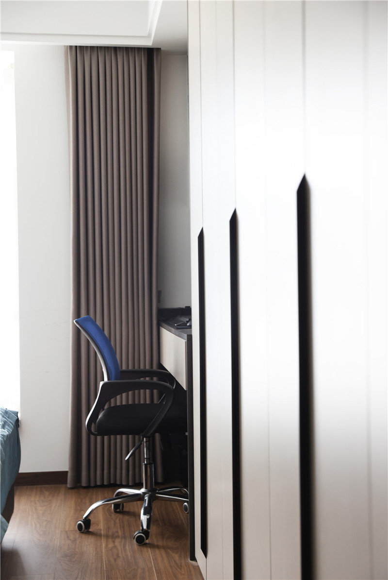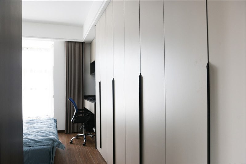 靠墻打一整面一柜到頂式衣柜,將其用作衣帽間+書桌,預(yù)留開放掛衣區(qū),滿足日常使用習(xí)慣;選用一字型長(zhǎng)條拉手,視覺上簡(jiǎn)潔、時(shí)尚。