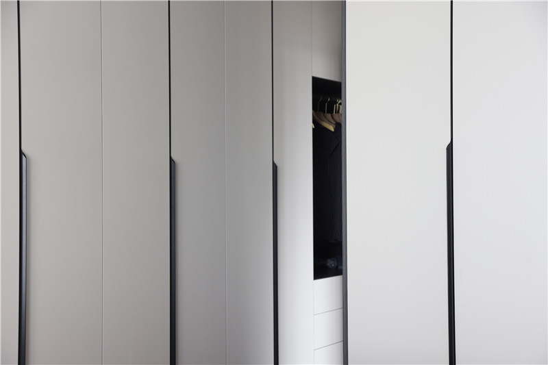 靠墻打一柜到頂式衣柜,選擇一字型長(zhǎng)條拉手,茶白色經(jīng)典熱門,放在臥室舒適自然。