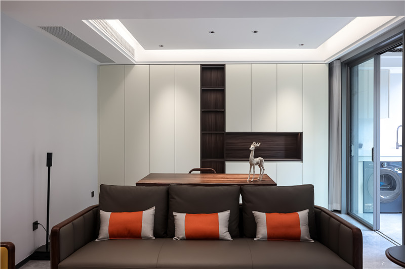 聽風(fēng)吟,賞葉落??拷年柵_(tái)的空間里我們將其設(shè)計(jì)為一個(gè)開放休閑區(qū),無論是想在這里辦公閱讀還是做手工、喝茶都是不錯(cuò)的選擇。榆木柜體的紋理清晰可見,搭配純凈的白色通頂柜,帶來一絲禪意,令人松弛神往。