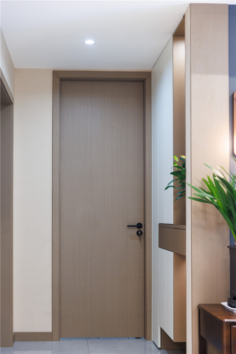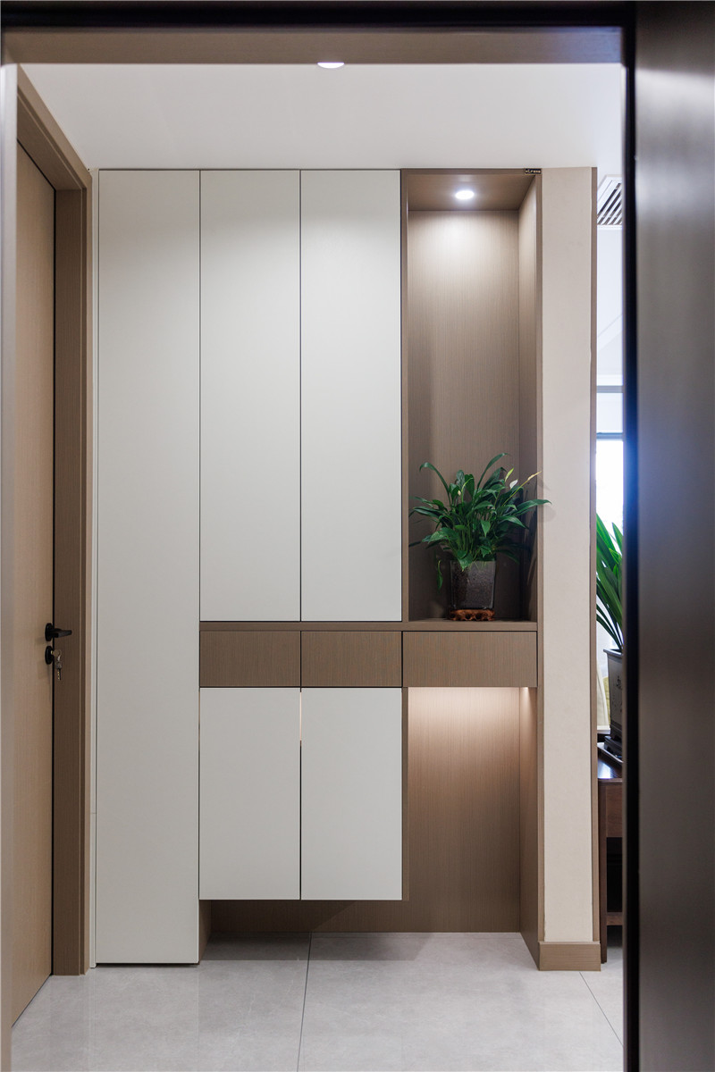 玄關柜設計遵從簡單設計手法,選用科技直紋與蘭迪白作拼色設計增添時尚感,讓空間不單調;門墻柜一體化選用客來??萍贾奔y,更加自然百搭。
