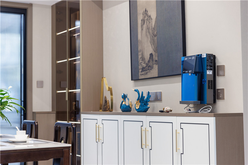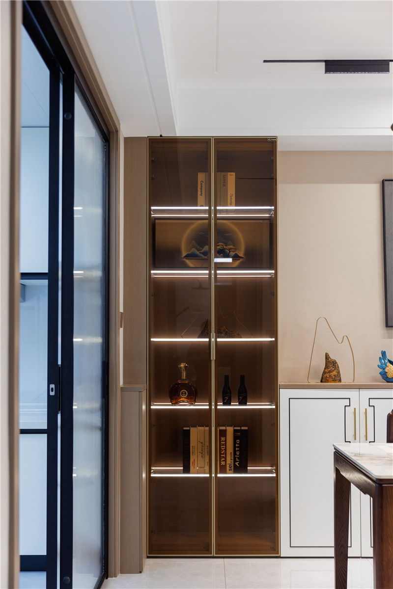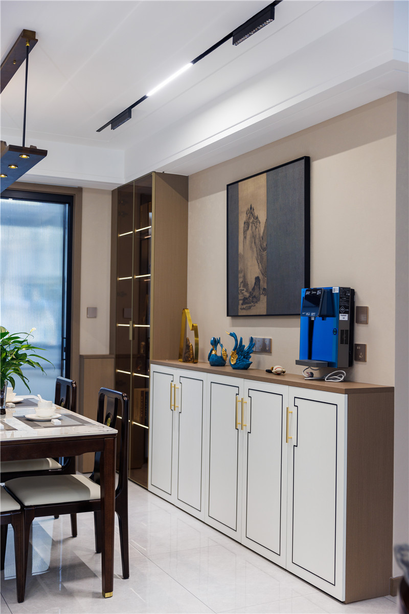 餐邊柜設計選用了矮柜+2組玻璃高柜,矮柜具有濃烈的中式風格,黑色方形刻線+金色拉手,既大方美觀又簡單高雅;玻璃高柜的選用,為餐廳增添一絲奢華氛圍。
