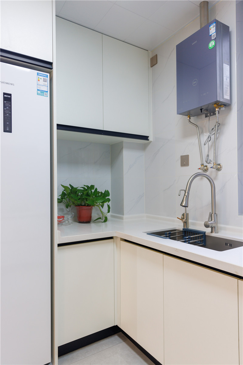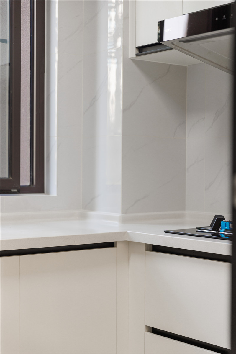 廚房面積有限,選用U型櫥柜設計合理的運用空間,蘭迪白與免拉手設計,使得空間簡潔干凈,符合廚房應有的基調。