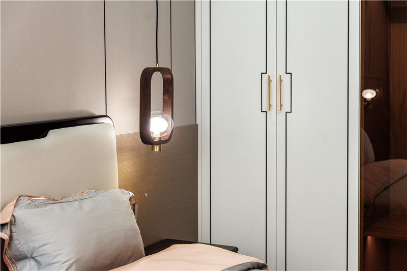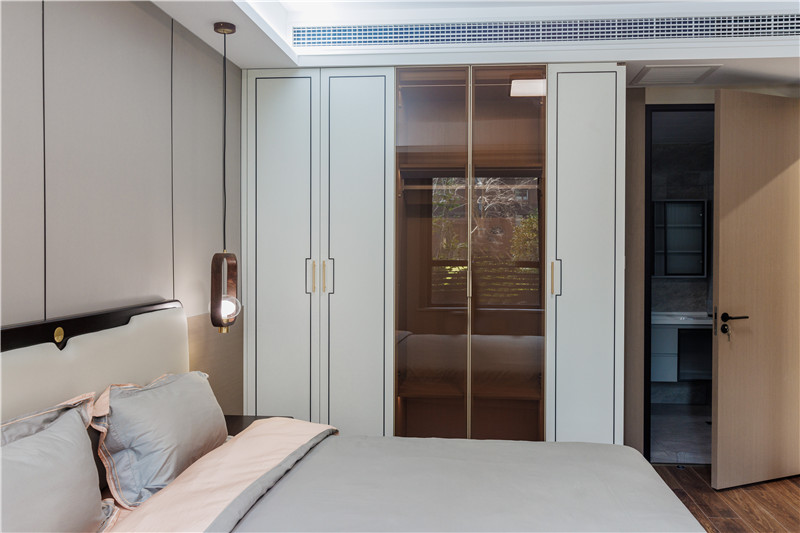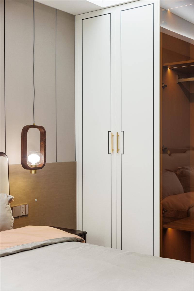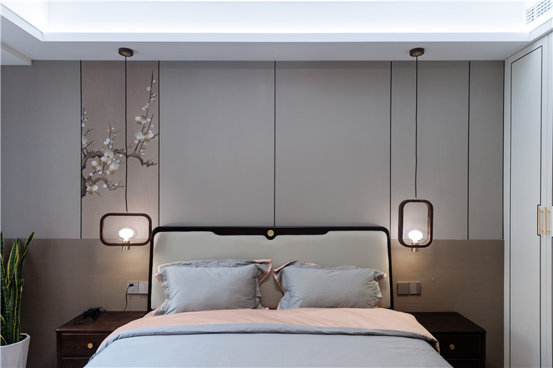 主臥延續(xù)了餐邊柜的配色設計,蘭迪白與科技直紋的恰到好處融合,充分發(fā)揮新中式的淡雅魅力。