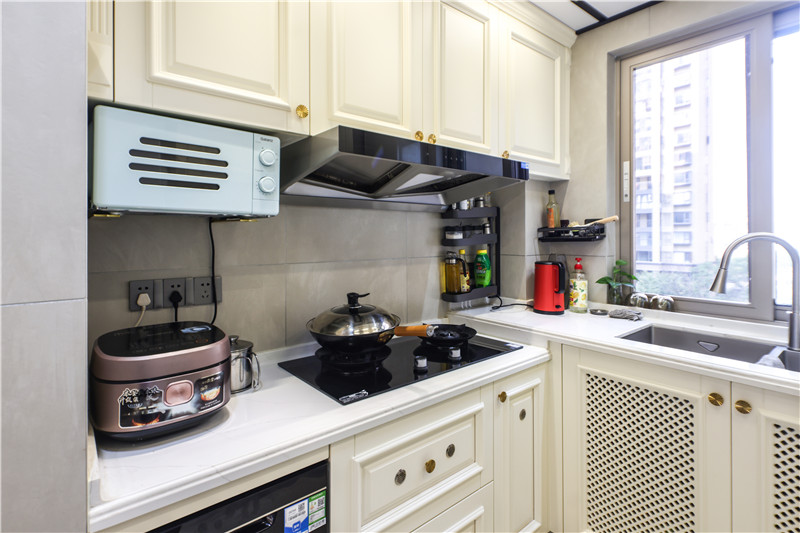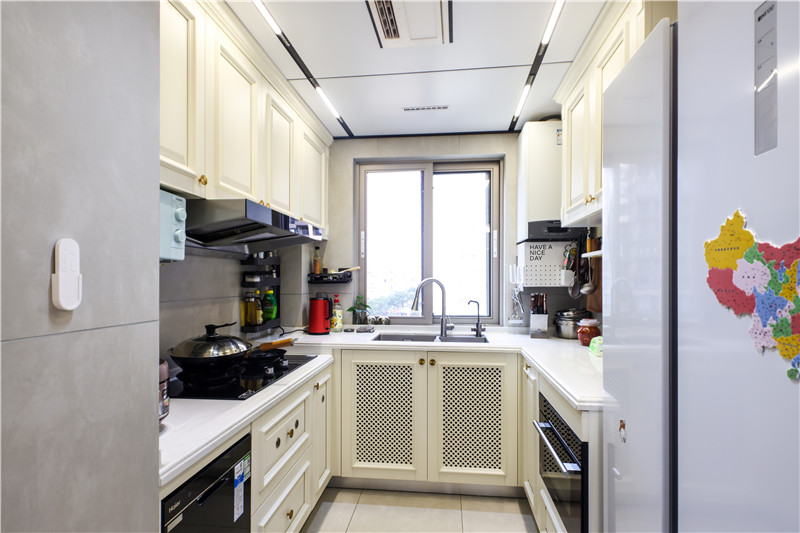 櫥柜整體U型構(gòu)造,遵循洗→切→烹→盛的動線,使得空間小而不局促;櫥柜加入鏤空設(shè)計,空氣流通;將烤箱等大電器嵌入櫥柜中,視覺統(tǒng)一清新。