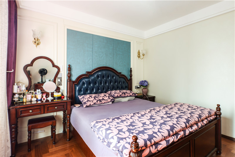 主臥:復(fù)古美式的雅致,是主臥空間傳達(dá)給人的韻味。床頭背景墻采用藍(lán)調(diào),形成拼色;床頭兩側(cè)古典樣式小吊燈,時尚奢華;一側(cè)床頭柜升級為梳妝臺,高級精致。