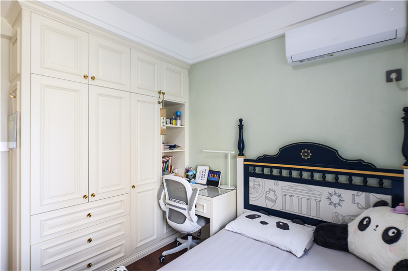 兒童房:床頭板樣式,讓人眼前一亮;衣柜延伸做書桌,協(xié)調(diào)自然;柜體設(shè)置為長衣、短衣及疊衣區(qū),明晰實用;整體兒童房色彩較豐富,守護(hù)孩子的童真童趣。