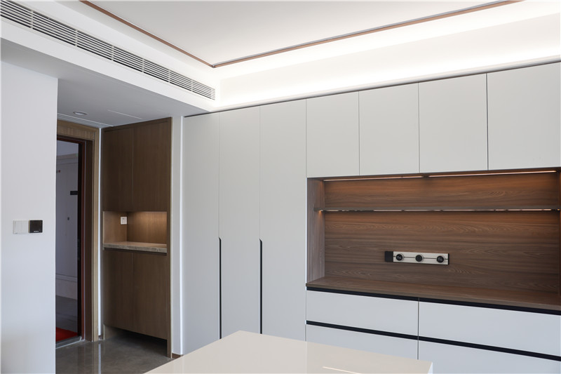 餐邊柜與玄關(guān)相連,整體一字型構(gòu)造,其莫蘭迪水漆純白色與黑玻形成跳色,增強(qiáng)空間美感;立柜+吊柜+抽屜柜,提升空間收納力;銑槽長(zhǎng)拉手,簡(jiǎn)約利落。