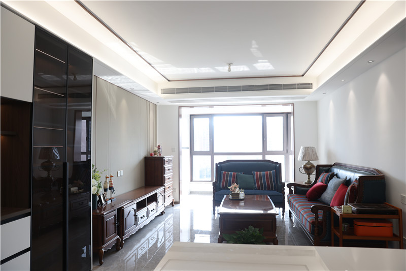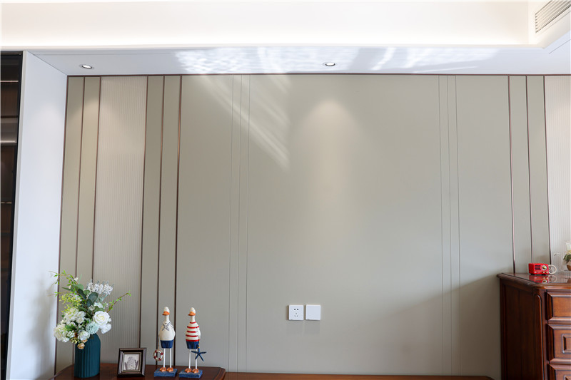 電視背景墻采用整面淺杏色背板,配以金屬色長(zhǎng)線條,彰顯時(shí)尚感;電視柜為一字型組合柜+獨(dú)立柜,深褐色滿滿的中古氣息,其實(shí)古銅樣式拉手與造型柜門(mén)組合,擁有高級(jí)質(zhì)感。