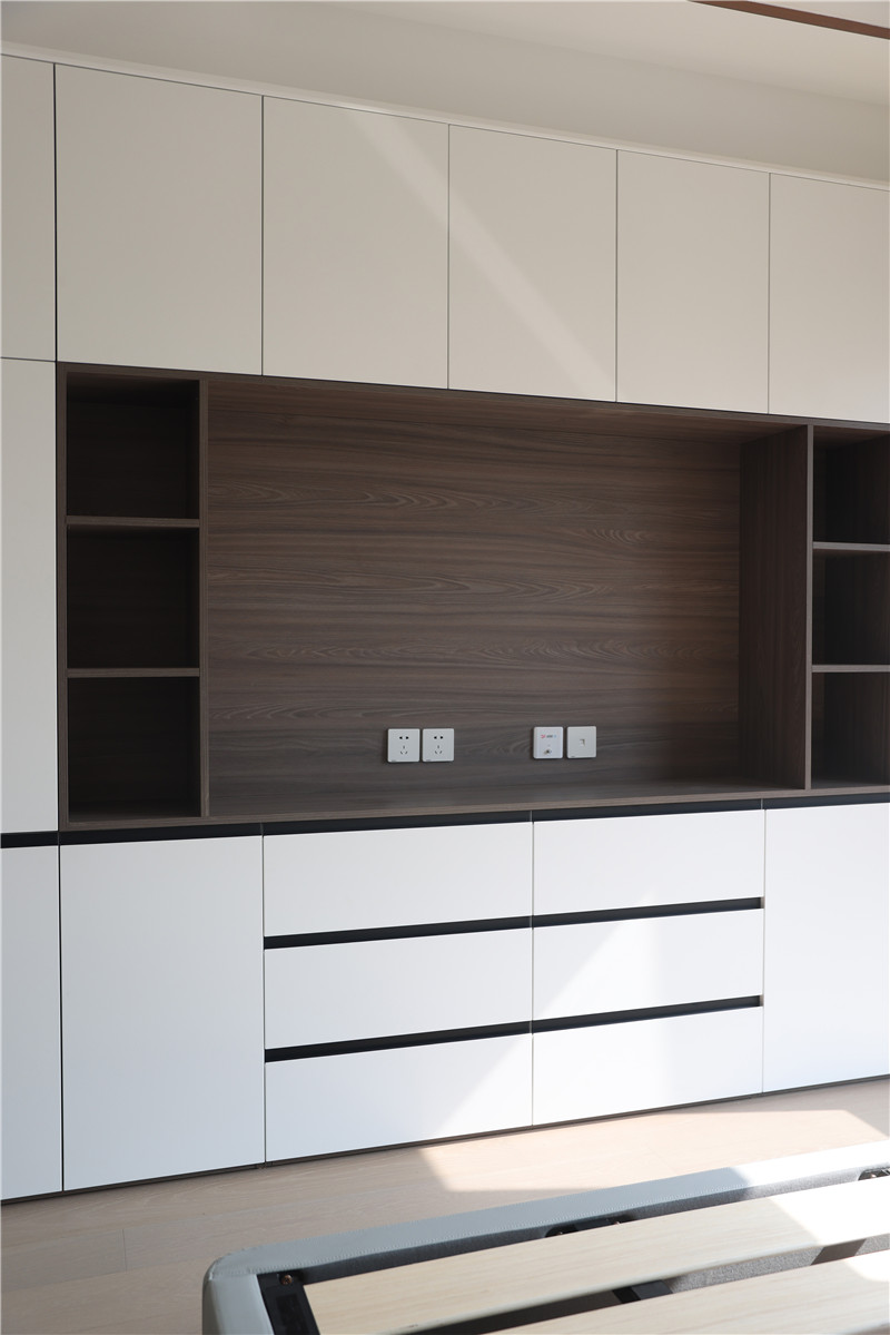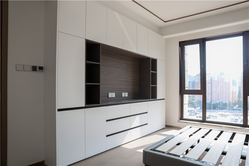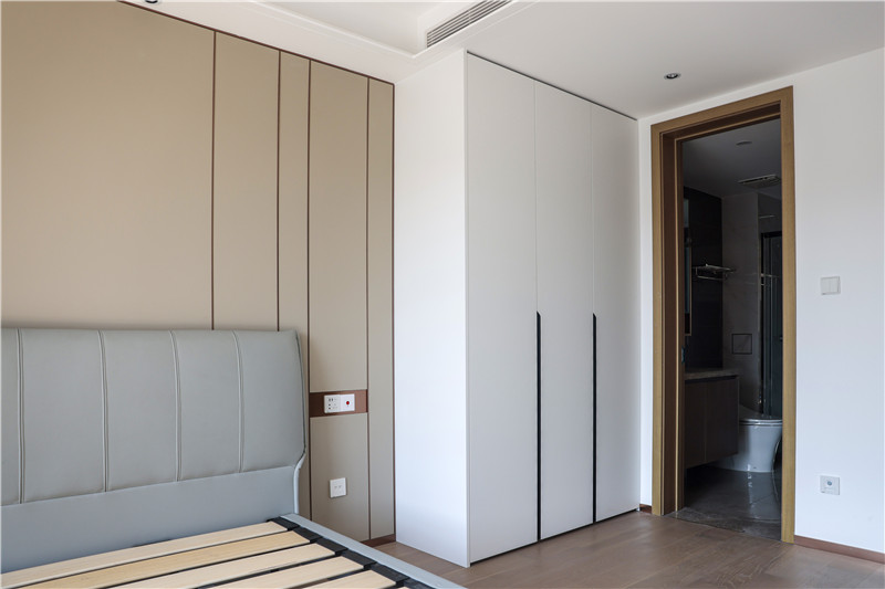 主臥:采用客廳同款背景墻,兩側(cè)預(yù)留插座為床頭燈或日常使用;衣柜與電視柜組合,純白與橡木色映襯,使得空間簡(jiǎn)約而不簡(jiǎn)單;一組整面到頂衣柜,內(nèi)部合理分區(qū)進(jìn)行有序收納。