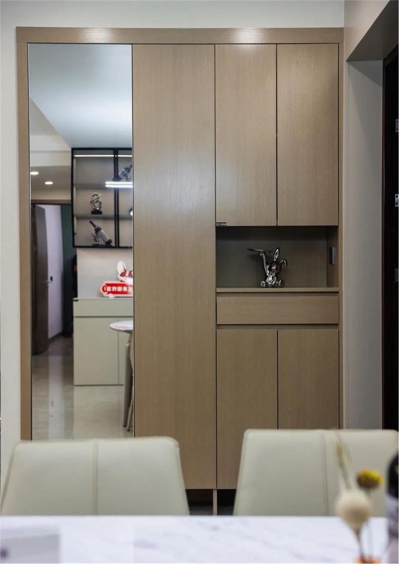 餐邊柜與護(hù)墻板色調(diào)統(tǒng)一,顯得空間和諧寬敞;玻璃吊柜內(nèi)置燈帶,既起到調(diào)節(jié)大面積茶白色帶來(lái)的素凈氛圍,又很好呈現(xiàn)輕奢風(fēng)強(qiáng)調(diào)的精致細(xì)節(jié);免拉手設(shè)計(jì)簡(jiǎn)約實(shí)用,也減少日常磕碰。