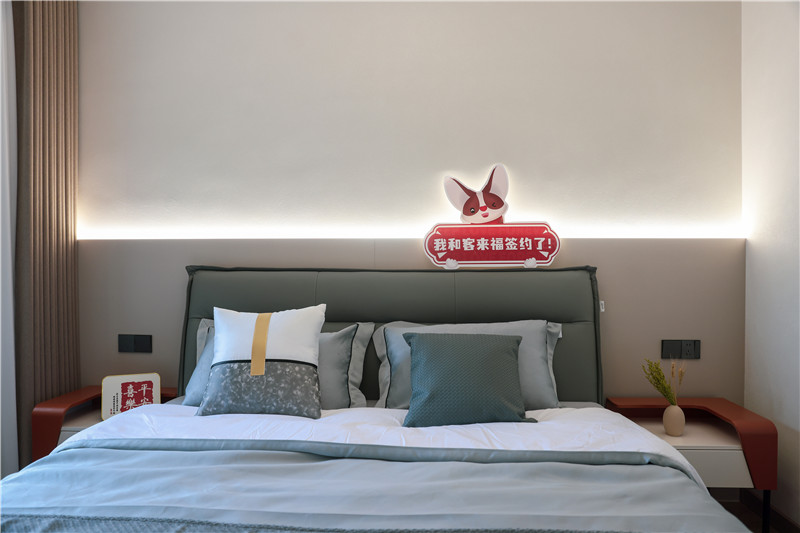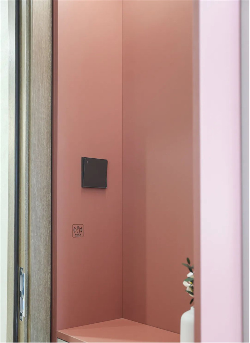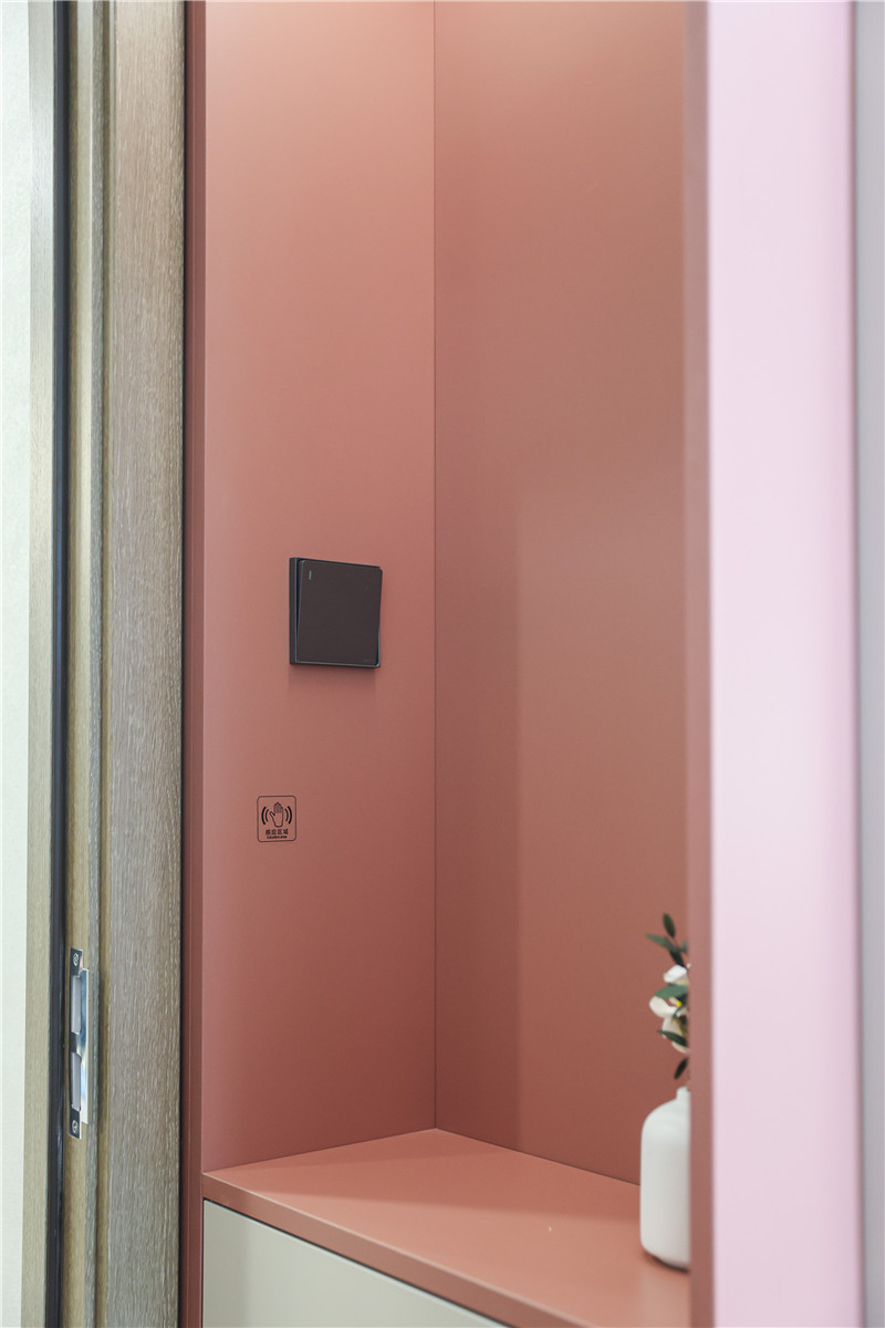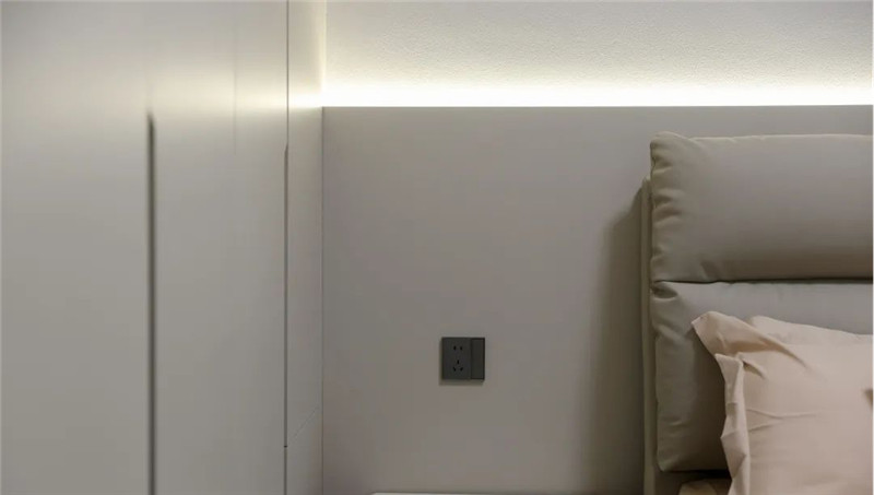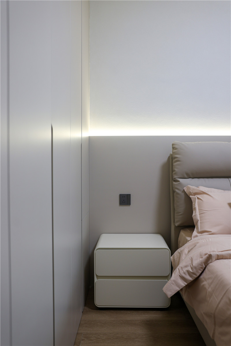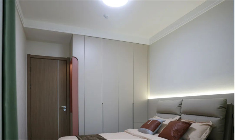 以實(shí)用為主要需求的臥室設(shè)計(jì):簡(jiǎn)約的配色與簡(jiǎn)單的衣柜設(shè)計(jì),一柜到頂式增加儲(chǔ)物能力、半銑j型拉手簡(jiǎn)潔實(shí)用,其中跳色粉套格設(shè)計(jì)既時(shí)尚又具有一番創(chuàng)意,為舒適的空間帶去一絲趣味。