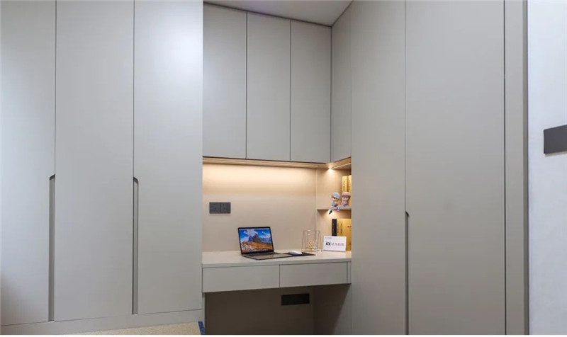 臥室衣柜風(fēng)格和諧統(tǒng)一,L型衣柜合理利用臥室空間并將收納功能擴(kuò)大到理想狀態(tài);拐角處設(shè)計(jì)辦公學(xué)習(xí)區(qū),實(shí)用不突兀,整個(gè)空間以簡(jiǎn)潔舒適為主。
