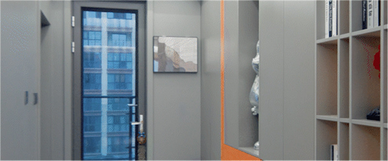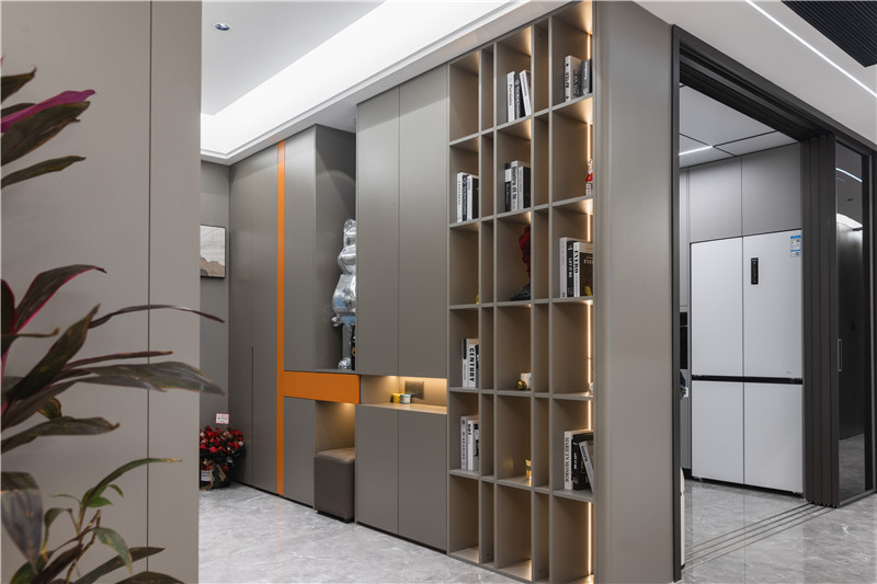 玄關(guān)柜到頂設(shè)計,充當(dāng)家里的隔斷,優(yōu)化空間動線。整體一字型構(gòu)造,以一抹橘調(diào)點色,穿插設(shè)計以設(shè)計感增強柜體美感。