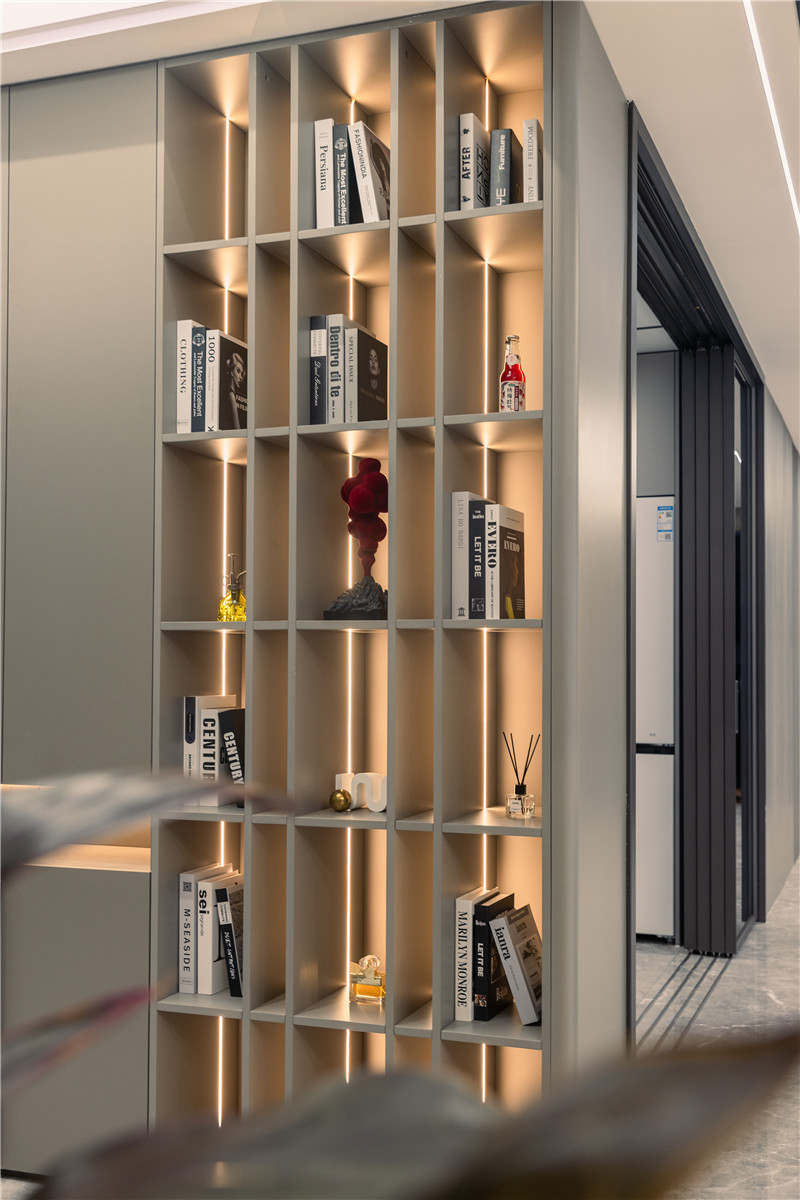 玄關(guān)柜一側(cè)做隔層,嵌入條帶燈,是裝飾區(qū)、也是閱覽區(qū)。