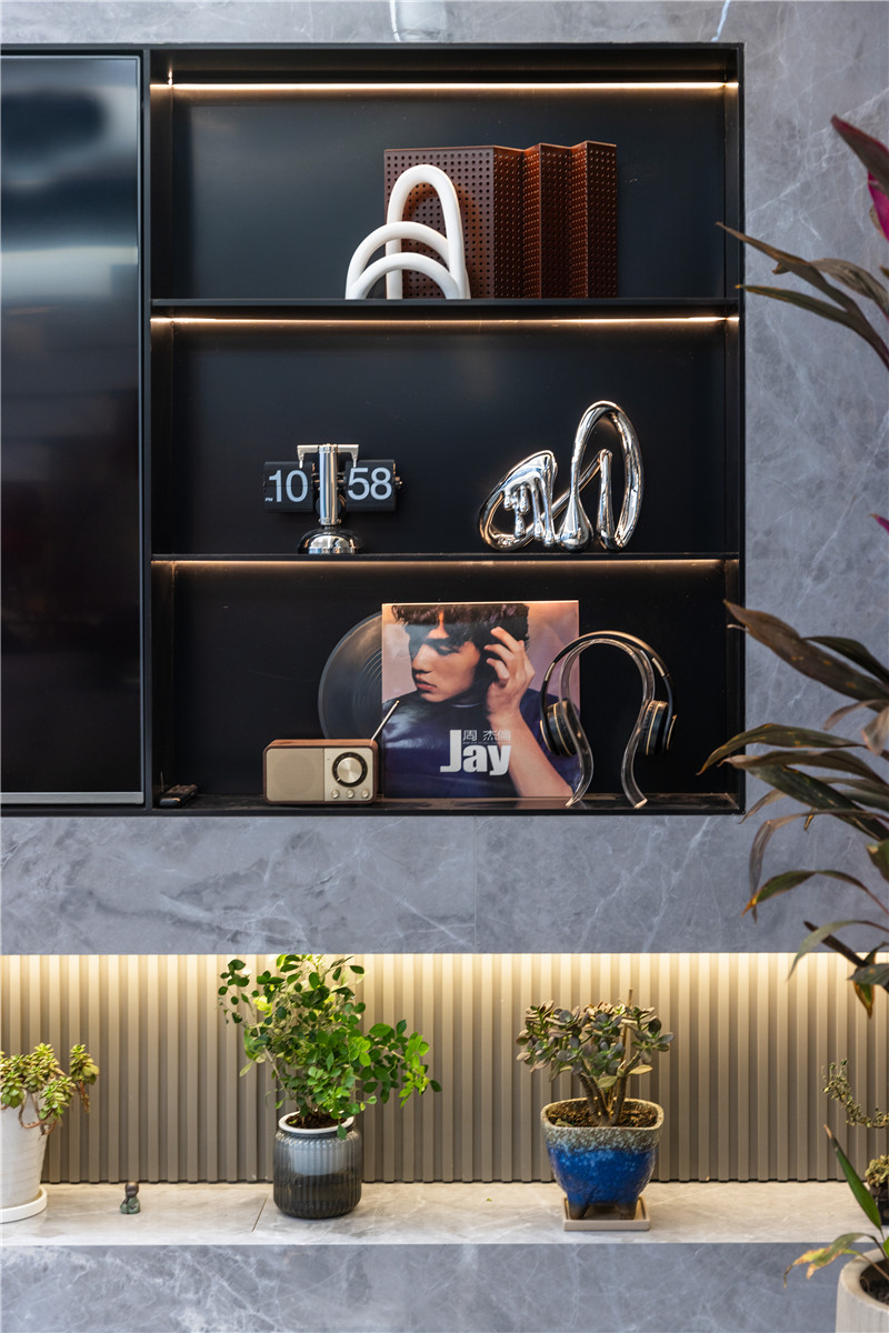背景墻采用縱向格柵及跳色,視覺感強;大理石板、門板拼接,其挑高設(shè)計突顯層次感;電視機旁側(cè)協(xié)調(diào)裝飾柜,深色調(diào)縱深感強。